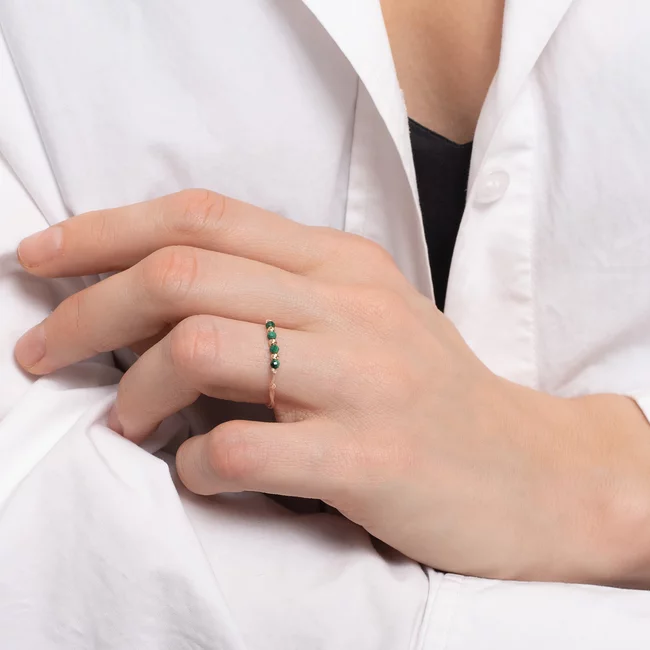 Descopera un inel minimalist, indragit de tot mai multe persoane. Comanda pentru tine sau cineva drag o bijuterie inedita, ce aduce un plus de noutate prin imbinarea snurului din matase sintetica cu bilutele din aur de 14K si pietre naturale semipretioase de Malachit, pietre considerate a fi tamaduitoare.