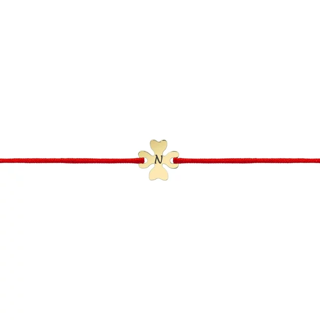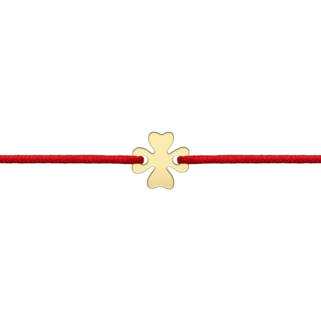 Brățara mărțișor cu *Trifoi de 10mm, placat cu aur galben*, montată pe snur roșu reglabil, este gândită ca un simbol discret al feminității – ușor de purtat nu doar în luna martie, ci pe tot parcursul anului.